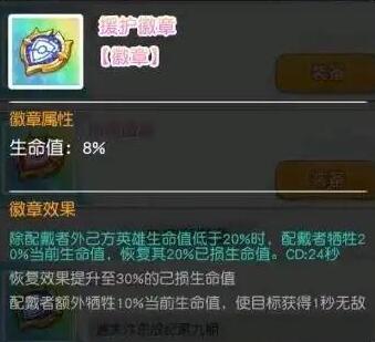 【1星】除配戴者外己方英雄生命值低于20%时,配戴者牺牲20%当前生命值,恢复其20%已损生命值。CD:24秒
