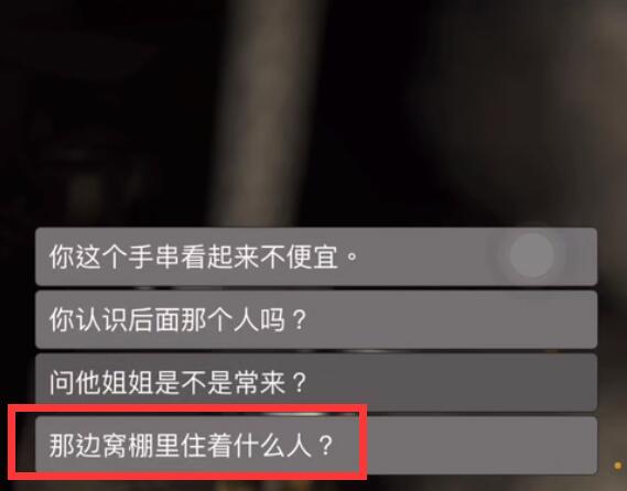 调查完窝棚里的线索之后重新回到烧烤摊,和小陈进行对话,点击“那边窝棚里住着什么人?”完成对话自动获取线索。