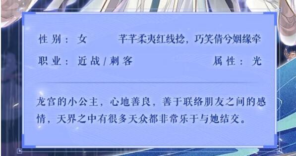 龙吉的称号红鸾星使,是一名近战刺客,光属性。她是龙宫中一个特别善良的小公主,喜欢联络朋友之间的感情,天界之中有许多天众都非常喜欢与她结交。