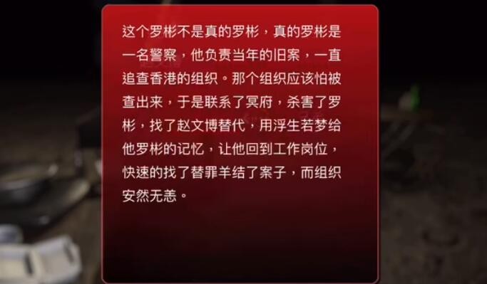 这个罗彬不是真的罗彬,真的罗彬是一名警察,他负责当年的旧案,一直追查香港的组织。那个组织应该怕被查出来,于是联系了冥府,杀害了罗彬,找了赵文博替代,用浮生若梦给他罗彬的记忆,让他回到工作岗位,快速的找了替罪羊结了案子,而组织安然无恙。