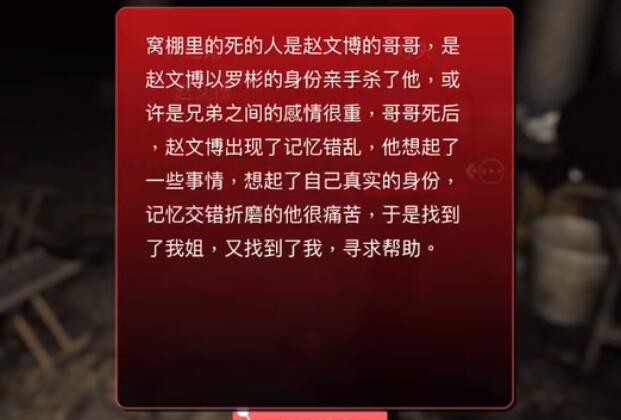 窝棚里的死的人是赵文博的哥哥,是赵文博以罗彬的身份亲手杀了他,或许是兄弟之间的感情很重,哥哥死后赵文博出现了记忆错乱,他想起了一些事情,想起了自己真实的身份,记忆交错折磨的他很痛苦,于是找到了我姐,又找到了我,寻求帮助
