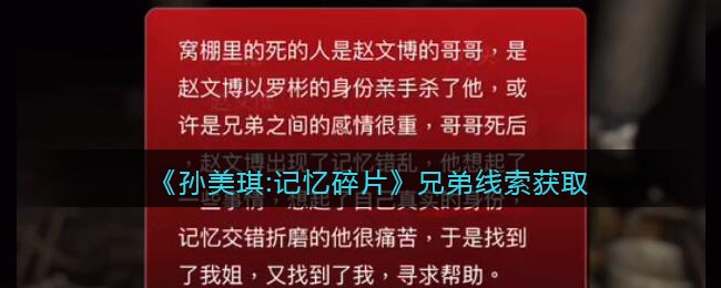 以上就是小编整理带来的《孙美琪疑案:记忆碎片》兄弟线索位置获取介绍,大家还喜欢吗?更多精彩内容,请点击关注易采游戏网,小编将持续为您更新!