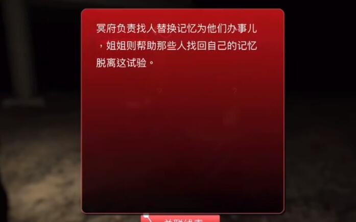 线索详情:冥府负责找人替换记忆为他们办事儿,姐姐则帮助那些人找回自己的记忆脱离这试验。