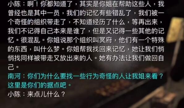 冥府:获取了【联络点】线索后,和小陈对话联系,点击【你们为什么找奇怪的人】,之后自动获取该线索