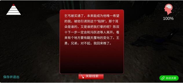一级线索 真相 专区 二级线索 机密档案 良知 女警 探险者 乞丐 三级线索 铁笼 诱饵 密码箱 铁环 工作笔记1 工作笔记2 工作笔记3 一袋钻石 三角形 药瓶 四级线索 警号 下水道钥匙 鱼钩 钥匙 一口井 钩子 匕首 工作证 记事本1 记事本2 被人打晕 鞋垫 涂鸦 斯克罗素 尸体 棕熊 给战友 给陈局 给妻子 给刘青春 五级线索 黑色的花 警示牌 破布 扣子 镁条 链子锁 门灯 弹珠 红色植物 碎玻璃 板砖 板砖符号 油漆桶 破裤子 破碗 一只耳朵 一桶蜂蜜 棍子 砂纸 一件衣服 垃圾堆 绳子 指甲 抓痕 项链 肉 生门一号 一段竹子1 一段竹子2 一段竹子3 可疑竹竿 竹竿密文1 竹竿密文2 竹竿密文3 B口 纸杯 求救信 糖果盒 点燃垃圾 弯曲猎枪