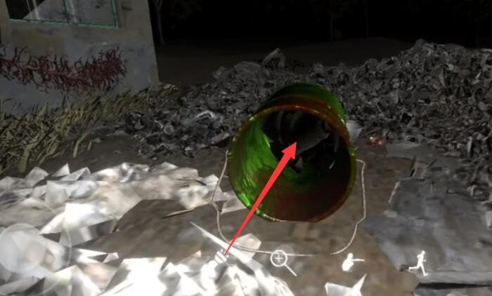 看到屋顶上面的油漆桶之后,使用砖头把它砸下来,之后点击桶里可以获取线索。