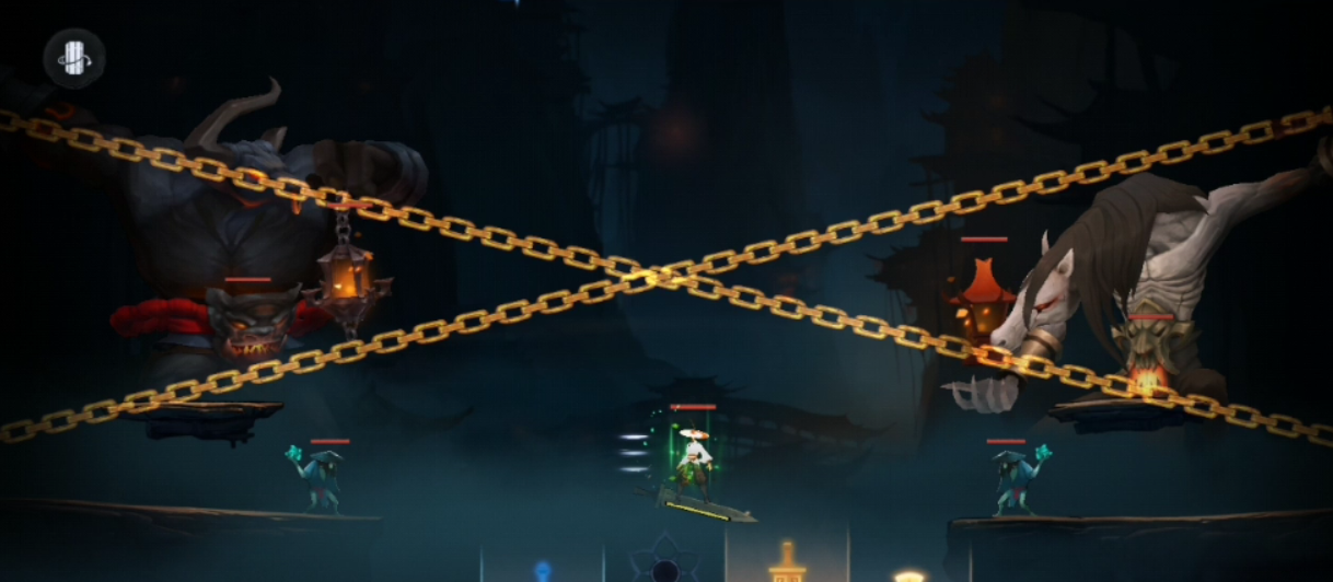 牛头马面二者持镰刀的手上举,召唤两条铁链会根据角色当前位置进行交叉攻击,铁链发射方向可能同上或者同下,铁链持续一个回合,下个回合开始前原路返回,返回途中可造成二次伤害,角色无论是被镰刀命中还是穿过铁链都会受到伤害,随阶段提升镰刀飞行速度加快