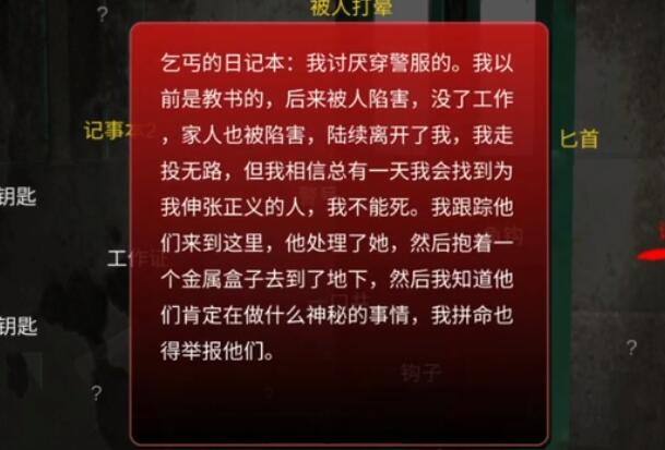 乞丐的日记本:我恨警察!我以前是教书的,后来被人陷害,没了工作,家人也被陷害,陆续离开了我,我走投无路,但我相信总有一天我会找到为我伸张正义的人,我不能死,我跟踪他们来到这里,他杀了她,然后抱着一个金属盒子去到了地下,然后我知道他们肯定干着不可告人的勾当,我拼命也得举报他