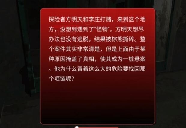 探险者方明天和李庄打赌,来到这个地方,没想到遇到了“怪物”,方明天想尽办法也没有逃脱,结果被棕熊撕碎,整个案件其实非常清楚,但是警局犹豫某种原因掩盖了真相,使其成为一桩悬案,他为什么冒着这么大的危险要找回那个项链呢