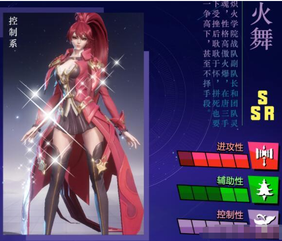 火系队伍核心之一。超级强力的火系控制,因为她的强力眩晕,必须架在灼烧状态的基础下才能发挥,因此最好是有其他的火系魂师进行配合。