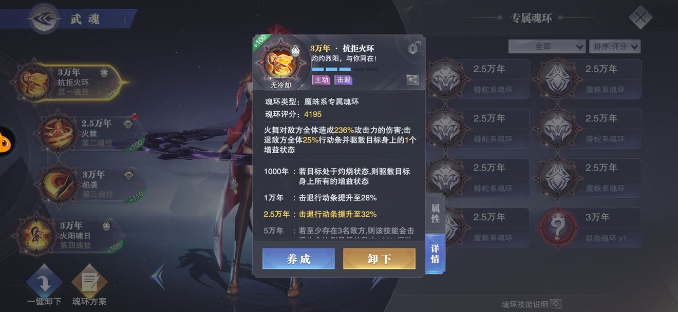 ①第一魂技。第一魂技的眩晕作为火舞的主要控制技能,在PVP和PVE中都较为重要,但眩晕条件需要敌方有灼烧效果。在还没有开放魔蛛魂环时,我们可以选择马红俊或高速焱与其搭配,在火舞回合前给敌方挂上灼烧,以便火舞打出控制。开放魔蛛后,我们可以选择魔蛛被动,火舞回合开始时为敌方挂上灼烧,此时火舞即可脱离火队完完全全成为一个单挂控制系。