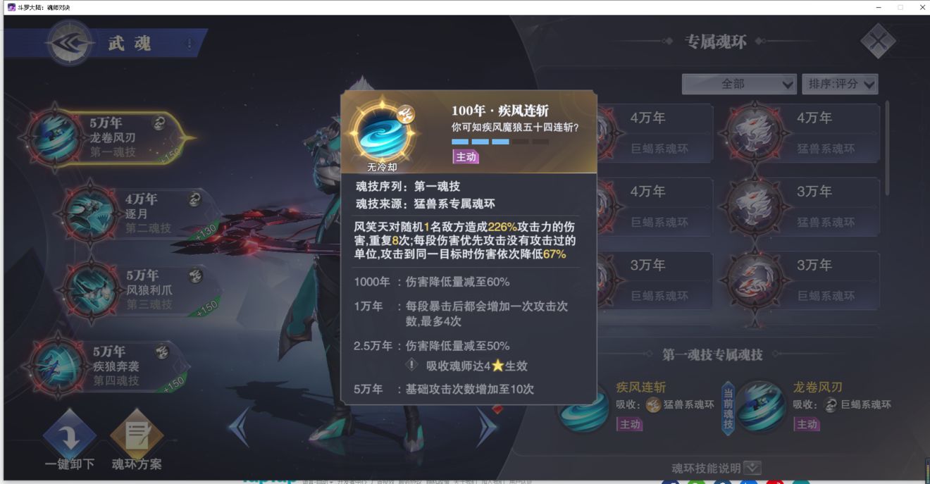 长图的多回合可以让风笑天有足够的时间将速度拉起来,这时候巨蟹一技能的伤害就凸显出来了,极速状态降低魂力消耗也使得风笑天的持续输出能力增强。在长图面对单一BOSS时我们可以选择猛兽系第一魂技,亲测伤害更高。
