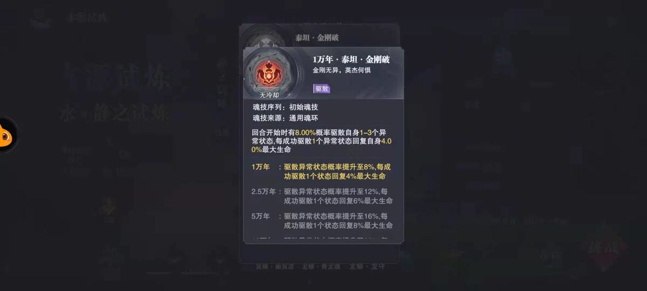 金刚破这个通用怎么说呢,从设计这个魂环的角度应该是想变向的削弱现在的独孤博减伤和一些比较烦人的buff,但是概率实在是不可恭维,万年百分之8驱散回4的最大生命血量,总有一种我赚了但是我真的赚了吗的感觉,这个金刚破后期必定是人手一个的,不管他概率再怎么低,触发效果再怎么小,毕竟驱散异常debuff还是一个很好的效果,包括独孤博的毒,别的一些类似沉默、冰冻效果,只要触发我就血赚,前期还是不建议携带,建议等通用魂环位置多了再去使用,前期没位置,后期必带。