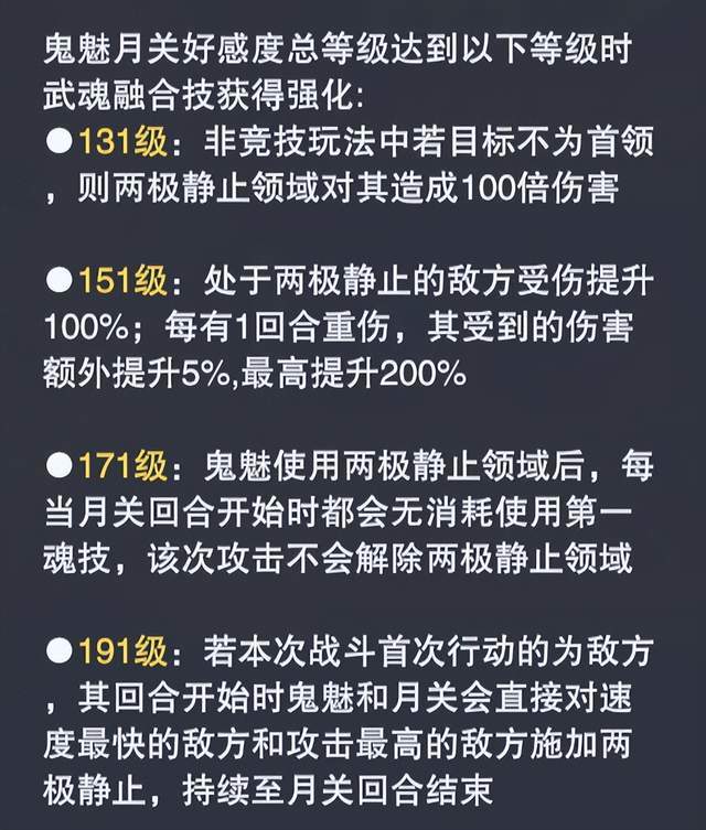 11级可对非竞技副本中的非首领目标造成100倍伤害12级可对两极静止中的敌方造成100%的增伤,且对方每有1回合【重伤】则可额外提升5%受伤,最高200%,联系到初始的100%就是合计最高300%的受伤提升13级可提供在鬼魅主导使用武魂融合技后,月关回合开始时他都会无消耗使用1技能来对敌方进行攻击,且该次技能使用并不会打断【两极静止领域】14级可提供战斗中若敌方抢到先手,则其回合开始时菊鬼会对敌方速度最快和攻击最高的两位敌人施加【两极静止】,这个效果持续到月关回合结束