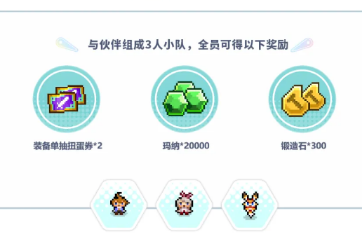 此外,邀请小伙伴组成3人小队,全员可获得装备单抽扭蛋券*2、玛纳*20000、锻造石*300的额外预约奖励~