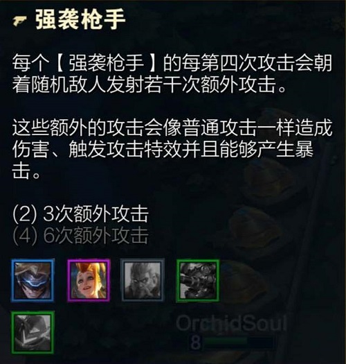 『强袭枪手』羁绊会使每个『强袭枪手』的第四次攻击,会朝随机敌人发射若干次额外攻击,这些额外的攻击会像普通攻击一样造成伤害并触发攻击特效。当场面上存在两位『强袭枪手』时,会触发3次额外攻击;而当存在四位『强袭枪手』时,会触发6次额外攻击。