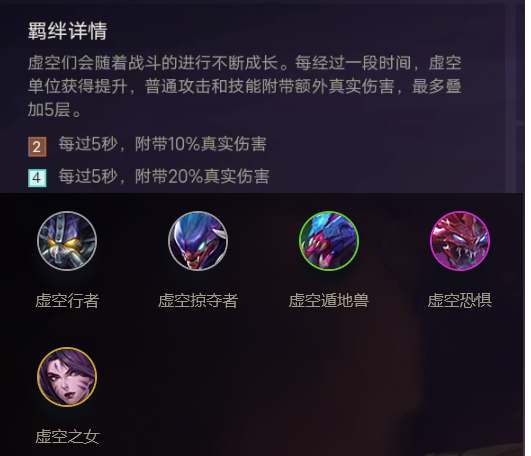 开局无效果,但5秒后虚空棋子就能造成额外的真伤(真伤无视护甲魔抗减伤),每过5秒就会叠加一次,可叠加5层,也就是说4虚空羁绊下虚空棋子在25秒后能造成额外100%真伤,如2星虚空恐惧技能伤害是400,释放一次技能就是400魔法伤害+400真伤共800伤害。