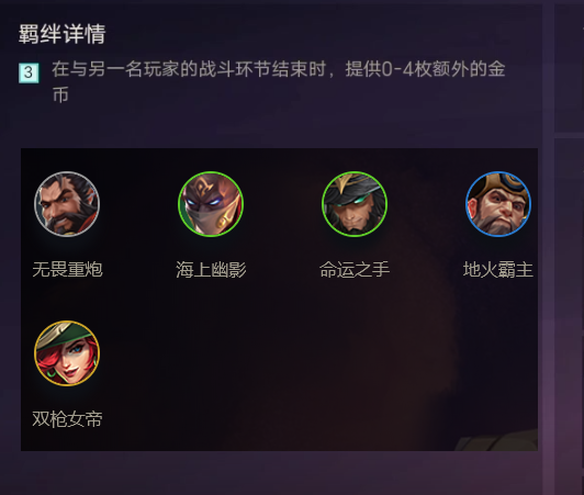 效果只要触发3豪侠羁绊,在战斗结束(不包括野怪),就能获得额外的0-4枚金币,我方多获取金币,而对手没有,我方就能形成经济优势,能更快的上人口搜到自己想要的卡组棋子。