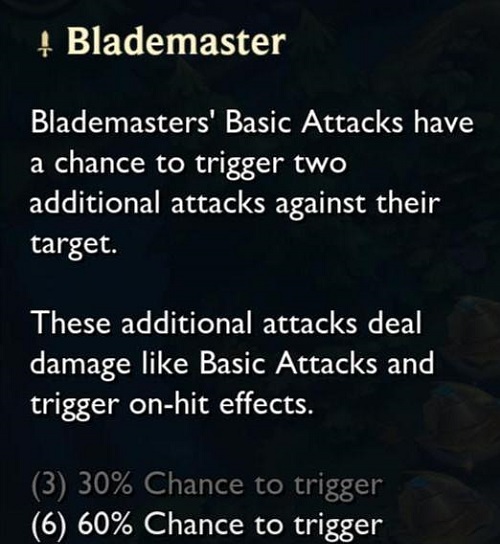 这是一个典型的攻击型羁绊,且较为依赖运气。倘若成功触发两次额外的攻击打击,那么『剑士』英雄造成的伤害便可以视为原本的三倍。这样的羁绊在“凯尔”这种攻速较高的英雄上尤为适用,极快的攻击速度使得“凯尔”造成额外的攻击打击次数会更多。