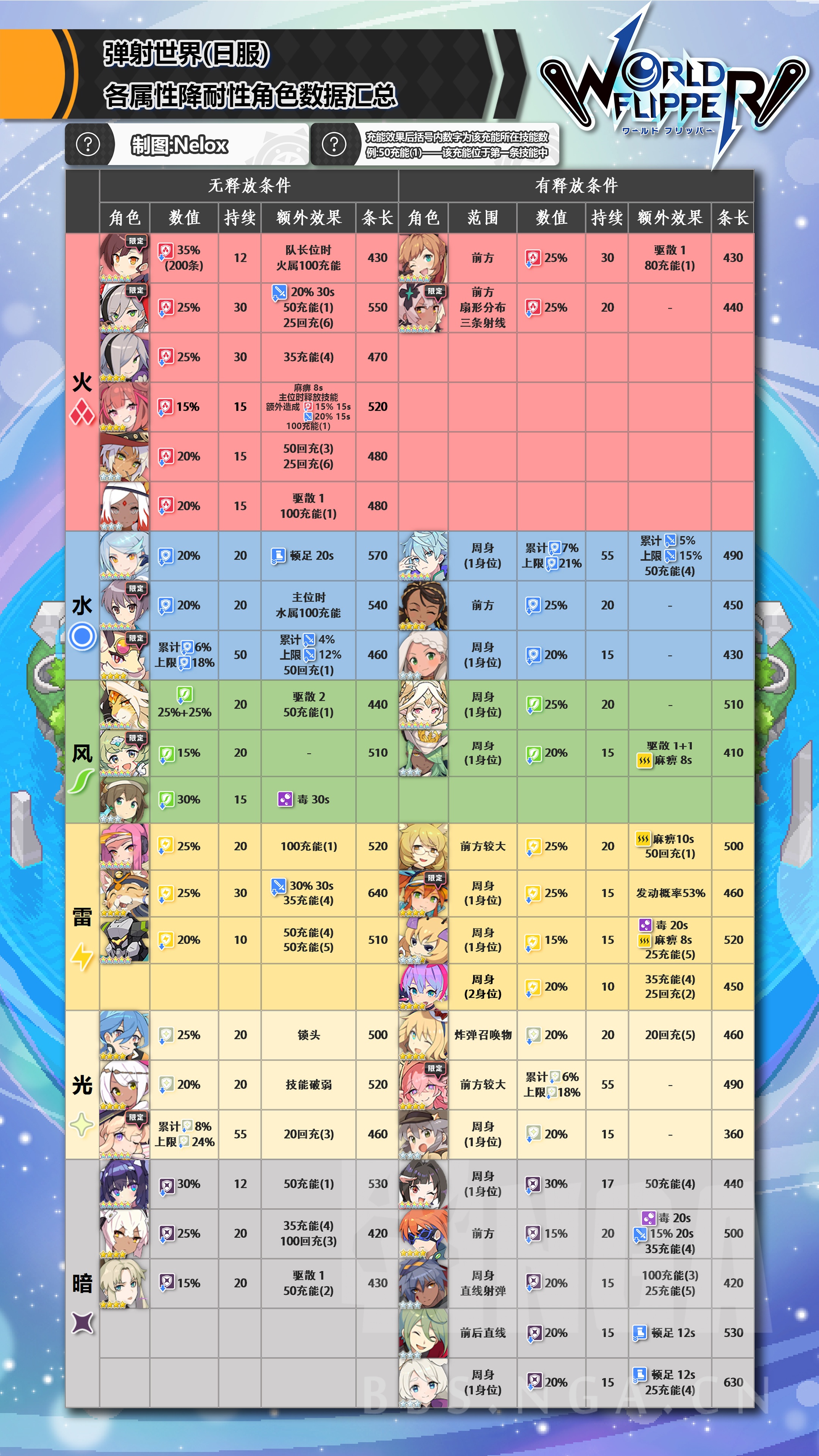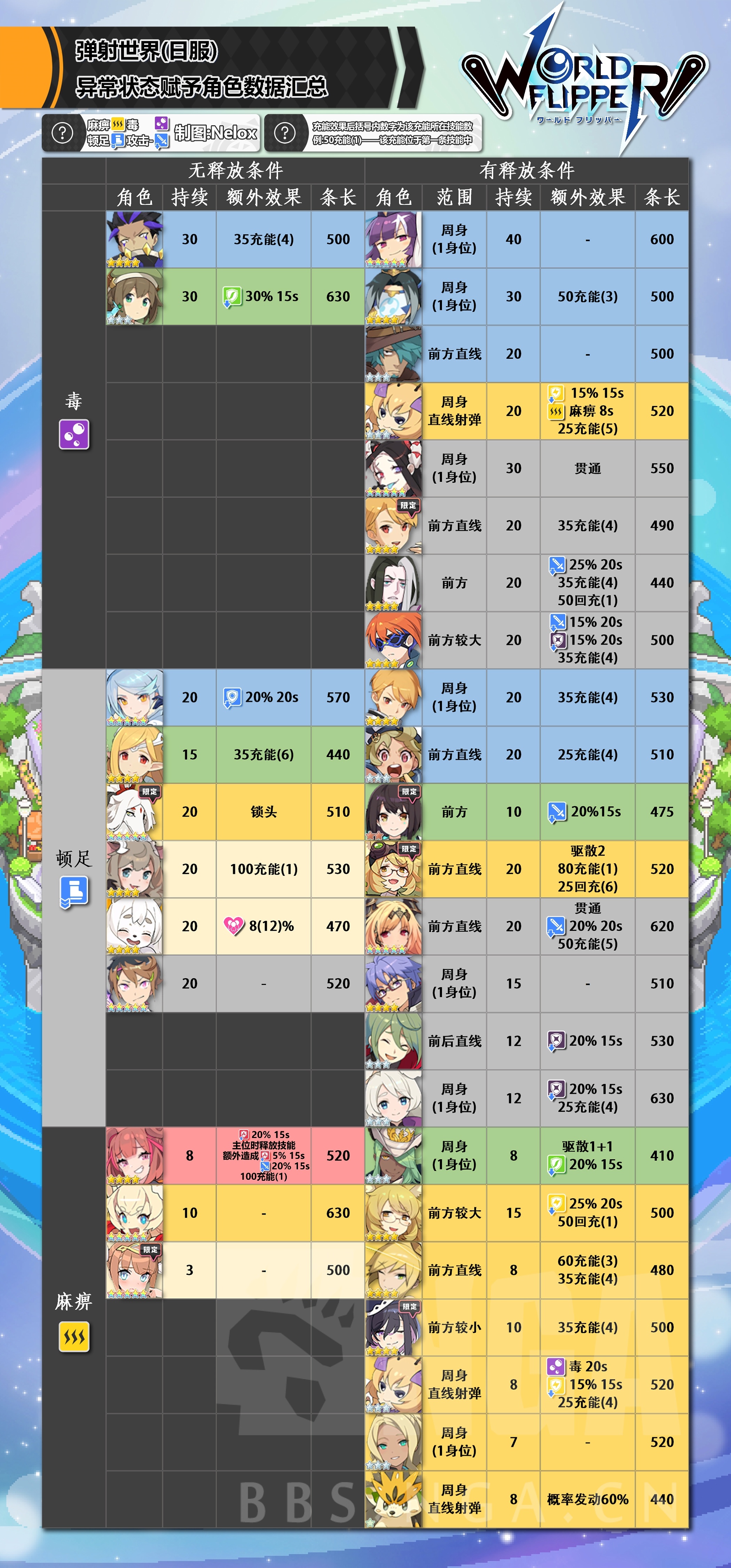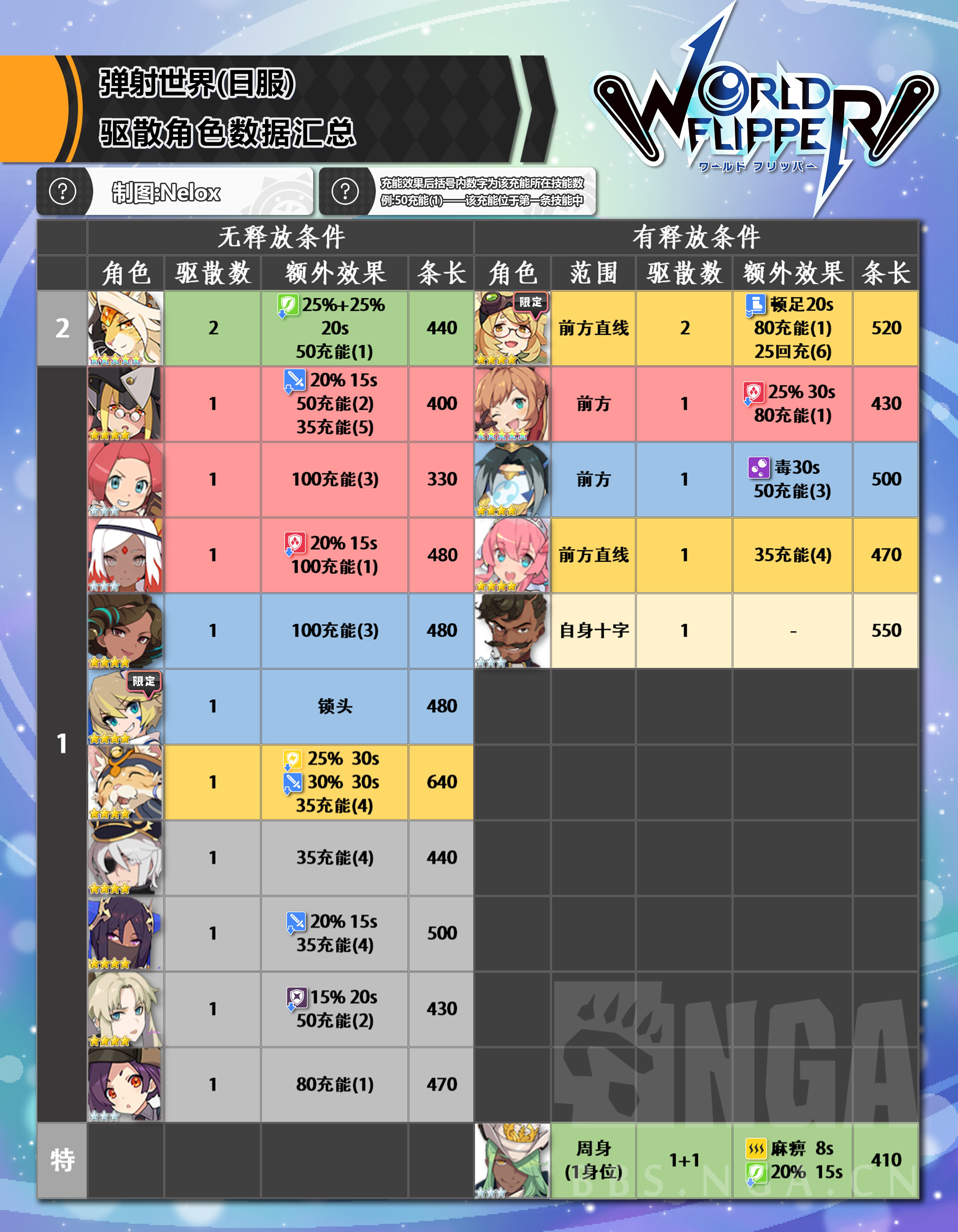 所以最终方向转变为整理所有技能能够使所有参战者收益(参战奶、攻刃、净化/降耐、驱散)的角色。