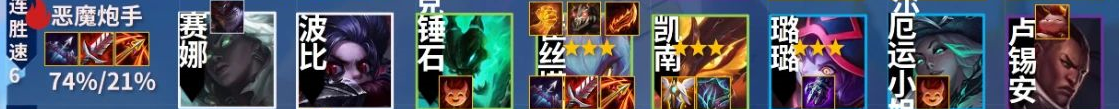 1、塞拉、波比、锤石、崔丝塔娜、凯南、璐璐、厄运小姐、卢锡安/提莫,组成羁绊为恶魔炮手,连胜速6,记得小炮为主C优先三星。