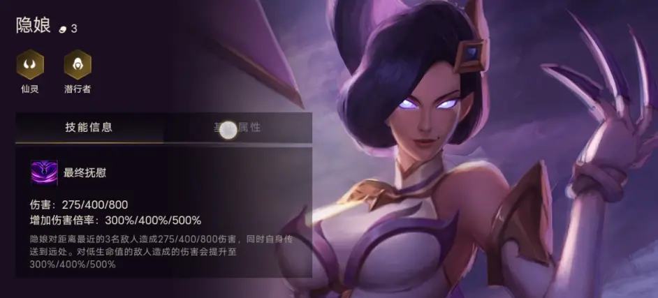 点评:伤害爆炸,完全可以作为刺客主C或者副C使用,敌人血量低于一半后一个大基本必死,唯一的问题就是大招完自身位置可能会被移动到一些尴尬的地方,但考虑她伤害实在太高了,有时候一个大就可以结束战斗,倒也无妨。推荐当副C,主C略微有些不稳定,副C反而收益更高!