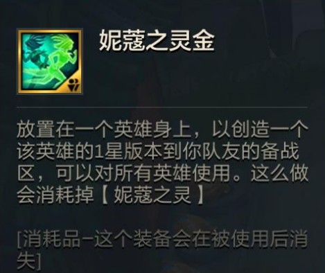 2、绿色的特殊妮蔻功能是给一个英雄放置,然后就可以让一个1星的英雄到队友的备战区,只对2费以下的英雄生效;