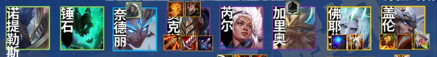 泰坦、锤石、奈德丽、贾克斯、芮尔、加里奥、佛耶戈、盖伦