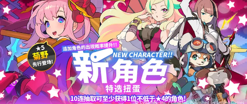 2. 本次扭蛋活动开启后,除★5角色「菊野」外,其他新出场的角色会同时加入教程扭蛋,并在后续的扭蛋中也会出现。此外,稀有度为★4或更高的新角色后续可通过星之碎片兑换。