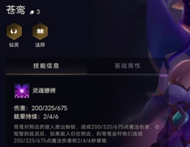 1、苍鸾是一个3费用的棋子,主要特点是输出以及控制,技能为群体伤害的2段效果,第一 段是直接造成伤害,第二段则是如果2秒后,敌人依然滞留在原伤害的范围,则会受到第二段伤害以及进入眩晕状态。
