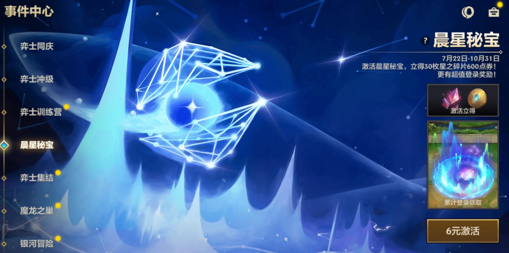 在2021年7月22日至10月31日期间,玩家可以花费6元激活晨星秘宝。玩家激活晨星秘宝,立得30枚星之碎片和600点券!更有超值登录奖励!