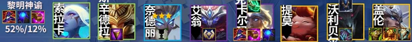 阵容推荐:索拉卡、辛德拉、奈德丽、艾翁、卡尔玛、提莫、沃利贝尔(卡兹克)、盖伦。