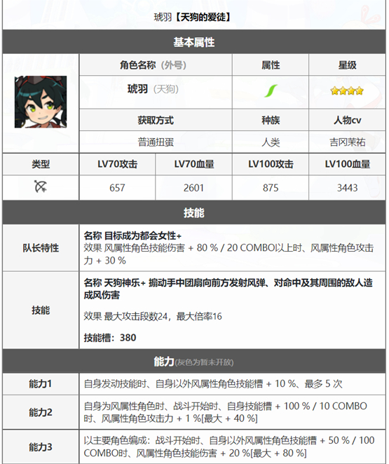 能力2提供自身满充的同时能力3也给风队提供全队的50充能,加速了风队的开局启动能力。与此同时能力1在自身释放技能时给予全队充能回转。一个四星角色,融合了启动和回转,提供不低的技伤和攻刃加成,主动技能也提供了高额的连击数。一切的一切都明示了琥羽是风队的核心。
