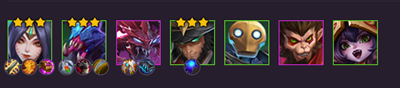 2、阵容中大部分都是2费卡,所以很容易上3,2个三星后上7继续补三星。
