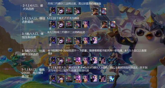 连胜3-1直接跳6人口,如果没连胜,3-2上六人口,继续挂3费拼多多关联羁绊最大化强度即可。