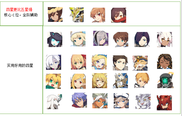 剩下的四星角色中,在榜内的角色在他们各自的属性里都有不同的作用,而非榜内的角色也仅仅是使用量偏小,大部分也有自己在队伍中的一席之地,同样地,在三星及更低星角色中,也有很实用的角色和一些队伍不可缺少的关键角