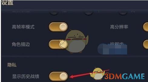 最后找到下方隐私里的显示历史战绩,点击关闭变成黑色即可你的隐藏成绩。