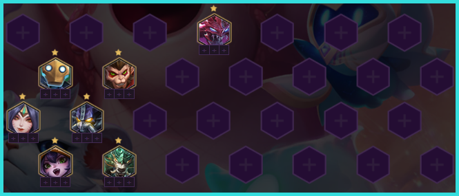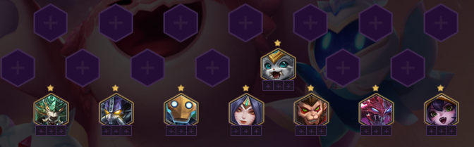 斗法狐狸阵容:悟空、虚空恐惧(大虫子)、仙灵女巫(露露)、狻猊之心(纳尔)、南天之怒(狼人)、虚空行者(卡萨丁)、蒸汽机器人、青丘灵狐(阿狸)。