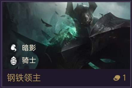 近战输出棋子。技能效果是对2格范围直线群伤,技能伤害较高,3星质变1000伤害。骑士羁绊能格挡伤害,对生存能力有所增强,但最强的是其暗影羁绊,2暗影羁绊开局直接降低敌方最高血量棋子50%最大生命值,是对局常搭配的小羁绊,这导致铁铠冥魂出错率极高。