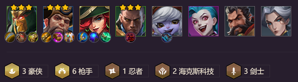 3豪侠为金币垫下基础,6枪手开局火力出击,御界守前排抗伤,海克斯科技开局降低敌方英雄攻速,更好的拖延敌方输出。
