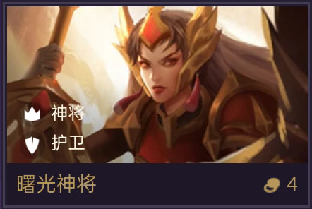 曙光神将就是蕾欧娜,她弥补了神将阵容欠缺的控场能力,先前赛季凑6神将不容易,凑出来后就很容易进入决赛圈。三星版本加了325点伤害和3秒晕眩时间,但4费英雄想要凑三星还是有些难。