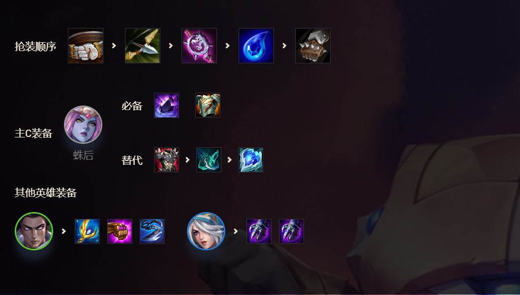 兹诺特传送门新改版后能够嘲讽4格内的敌人,搭配上石像鬼石板甲每成为敌人的目标就增加18双抗,两件装备能够直接让蛛后在前排肉的飞起。最后一件装备视情况而定,一般等4-2看看有没有荆棘之甲、幻影之舞,没有神装优先搭配冰霜之心。