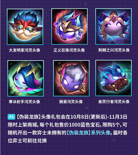 累计7日即可孵化龙蛋,即可在以下头像中随机获得一款任意头像,大发明家河灵头像、正义巨像河灵头像、荆棘之兴河灵头像、寒冰射手河灵头像、腕豪河灵头像、兽灵行者河灵头像。弈士们,赶紧前往游戏参与黄金龙蛋签到活动哟,领取属于你的“伪装龙族”系列头像!