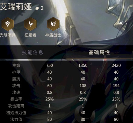 基础属性 ★ ★★ ★★★ 生命 750 1350 2430 护甲 40 40 40 魔抗 40 40 40 物攻 60 108 194 攻速 0.8 0.8 0.8 暴击率 25% 25% 25% 攻击距离 1 1 1 初始法力值 40 40 40 法力值 80 80 80