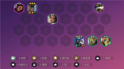 羁绊体系:4狂野、1忍者、3潜行者、3换形师、1神将、1约德尔人、1豪侠、1龙、1斗士。