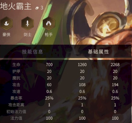 地火霸主是群伤魔法炮台。3羁绊棋子,优质的血量700,技能周期性释放火药桶,释放技能时候引爆火药桶造成中等魔法伤害,且可以触发攻击特效。剑士与枪手羁绊增加其攻击次数,变相增加回蓝。是剑枪阵容中可以主C的棋子。