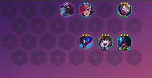 虚空恐惧-科加斯(4)、皮城执法官-蔚(3)、蒸汽机器人-布里茨(2)、虚空掠夺者-卡兹克(1)、仙灵女巫-露露(2)、虚空遁地兽-雷克塞