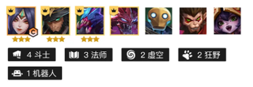 3-2拉六人口,这时候上4斗2狂野,先不要上3法,卡着利息追三星,追三优先级:命运之手>青丘灵狐>虚空遁地兽>仙灵女巫>机器人,这个阵容有5张2费卡可以追三,2张三星卡后可以上7人口补出完整羁绊继续追三。