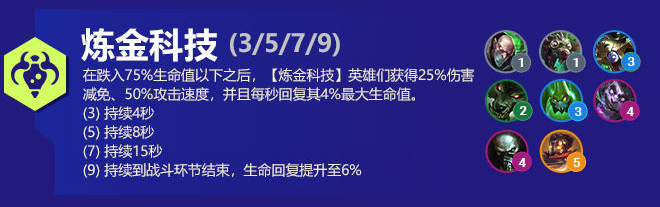 在跌入75%生命值以下之后,【炼金科技】英雄们获得25%伤害减免、50%攻击速度,并且每秒回复其4%最大生命值。