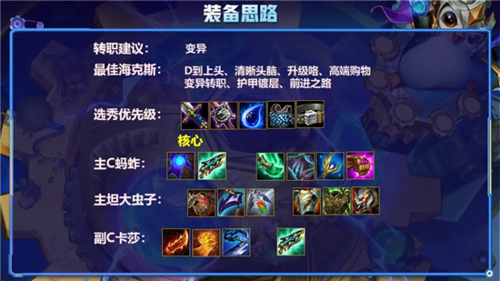 有一个变异海克斯或者转职最好,这样可以在有同行的时候7人口D3费2星稳血,或者直接满羁绊速人口,同行的话赌不出三星蚂蚱双方强度主要看2星的卡莎或者维克托。